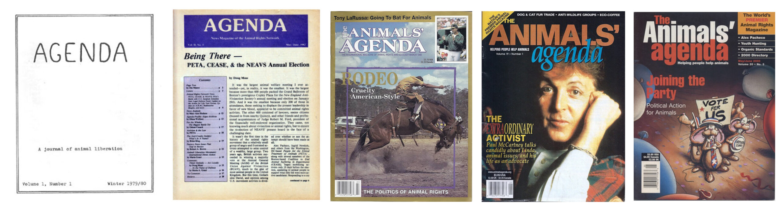 For almost a quarter of a century, from its first issue in Winter 1979/80 to its last in March/April 2002, The Animals’ Agenda magazine held a mirror up to the animal advocacy movement, and presented in an informative and accessible format the means by which humans both harmed and helped animals. In 157 issues, Agenda explored factory farming, vivisection, and the use of animals in entertainment, clothing, and for labor. It profiled rescuers, sanctuaries, thought leaders, and ordinary activists. It challenged advocates to think about their commitments and educated the general public.